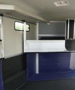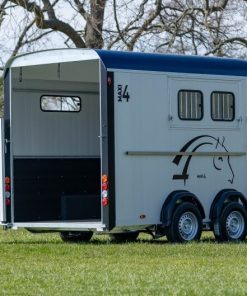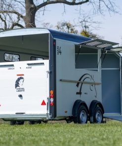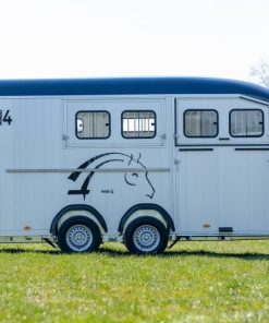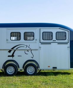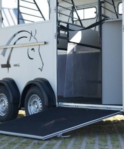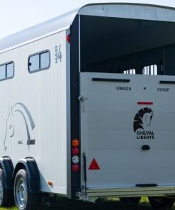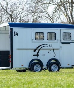 Oppdag Cheval Liberté MAXI 4, en romslig 4-hesters hestehenger med frontutlasting. Utstyrt med to ventilasjonsvinduer og et stort salrom med vindu, gir denne hengeren hestene dine optimal komfort. Den innovative Pullman 2 fjæringssystemet sikrer en behagelig reise, og med en vekt på kun 1510 kg, er den både lett og robust. Laget av eloksert aluminium og glassfiber, er MAXI 4 designet for å vare. Denne hestehengeren kan få Tempo 100-godkjenning.