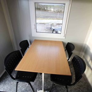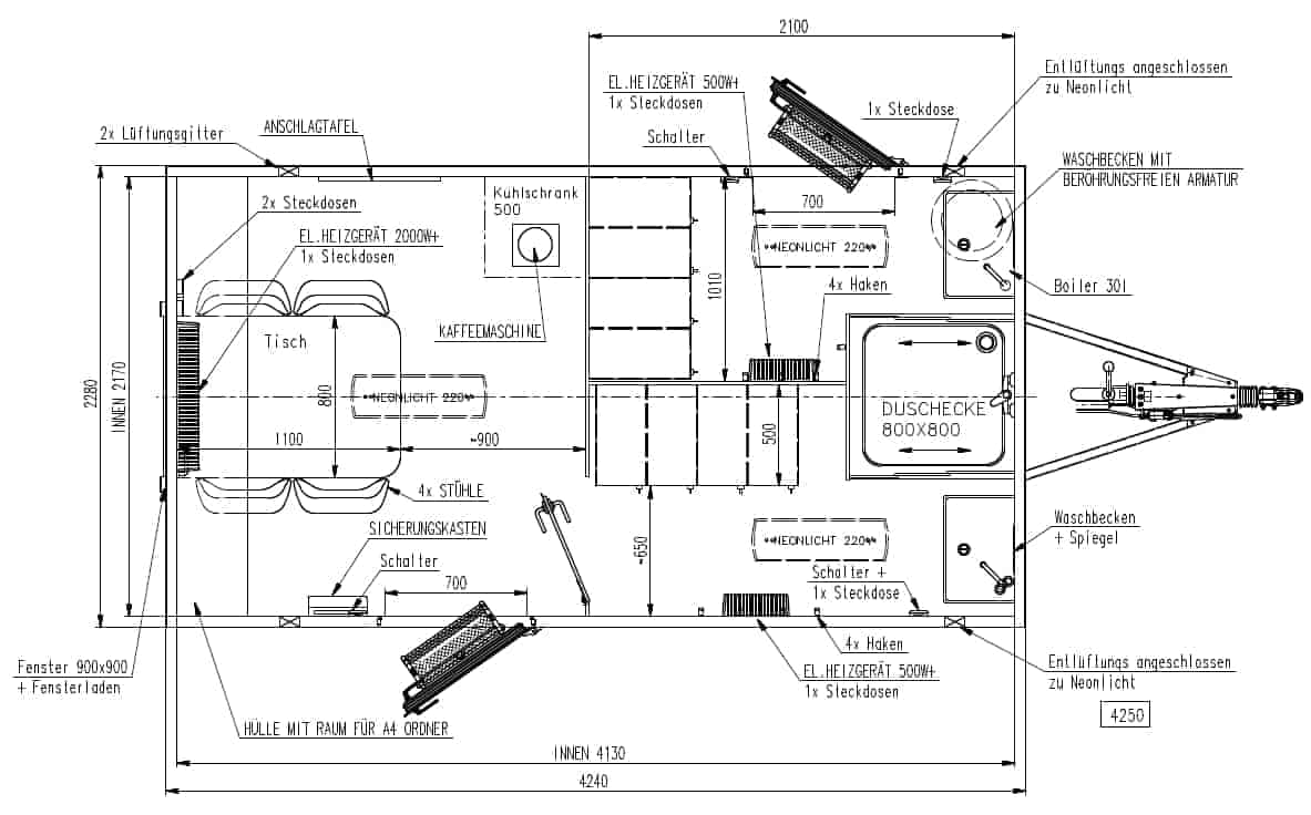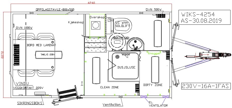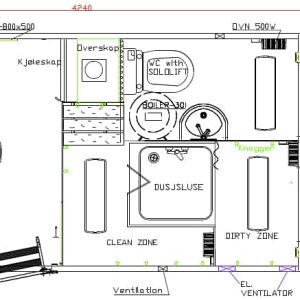 Vognen leveres med skitten og ren sone, WC m/kvern og egen spiseplass og garderober.