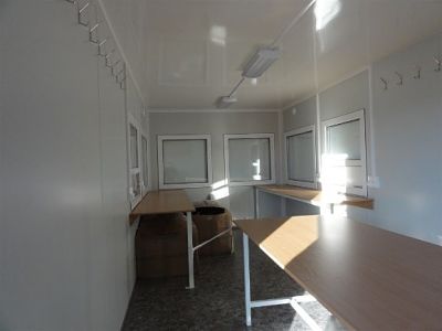 Rennkontoret leveres klar til bruk. Innredet med bord, stoler, oppslagstavler, skuffeseksjoner, overskap, panelovener, lyskilder, kjøleskap og kaffetrakter.