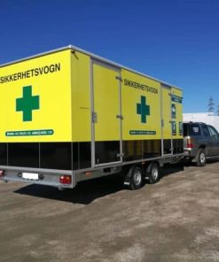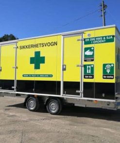 Denne sikkerhetsvognen kan leveres fullt utstyrt med førstehjelpsutstyr, brannslukker og HMS-tavle.