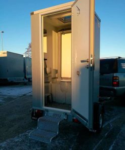 Vår toalettvogn er utviklet i Norge og bygget for å tåle tøffe værforhold med solide stålvegger og gulv, i motsetning til plast eller fiberglass. De er godt isolert, noe som sikrer komfort og funksjonalitet under norske forhold. Hver vogn er utstyrt med nødvendige fasiliteter, inkludert et kjemikalietoalett, håndvask med fotpumpe, takbelysning (230V), en 500W panelovn, speil, toalettpapirholder og en klesknagg på innsiden av døren. Dette gjør dem ideelle for arbeidsgrupper, midlertidige bosteder under oppussing eller som reservebosteder. Vi tilbyr full tilpasning av vognene for å møte spesifikke behov, slik at du får en løsning som passer perfekt til ditt prosjekt. Med lang levetid og skreddersydde alternativer, er våre tilhengere en pålitelig og funksjonell investering for enhver virksomhet.